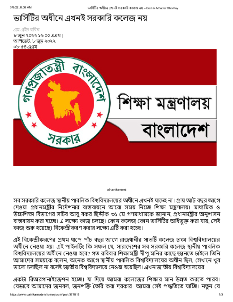 ভার্সিটির অধীনে এখনই সরকারি কলেজ নয় – Dainik Amader Shomoy Published on 08 June 2022 Newspaper দৈনিক আমাদের সময় Category Educational Ministry / Departments Download