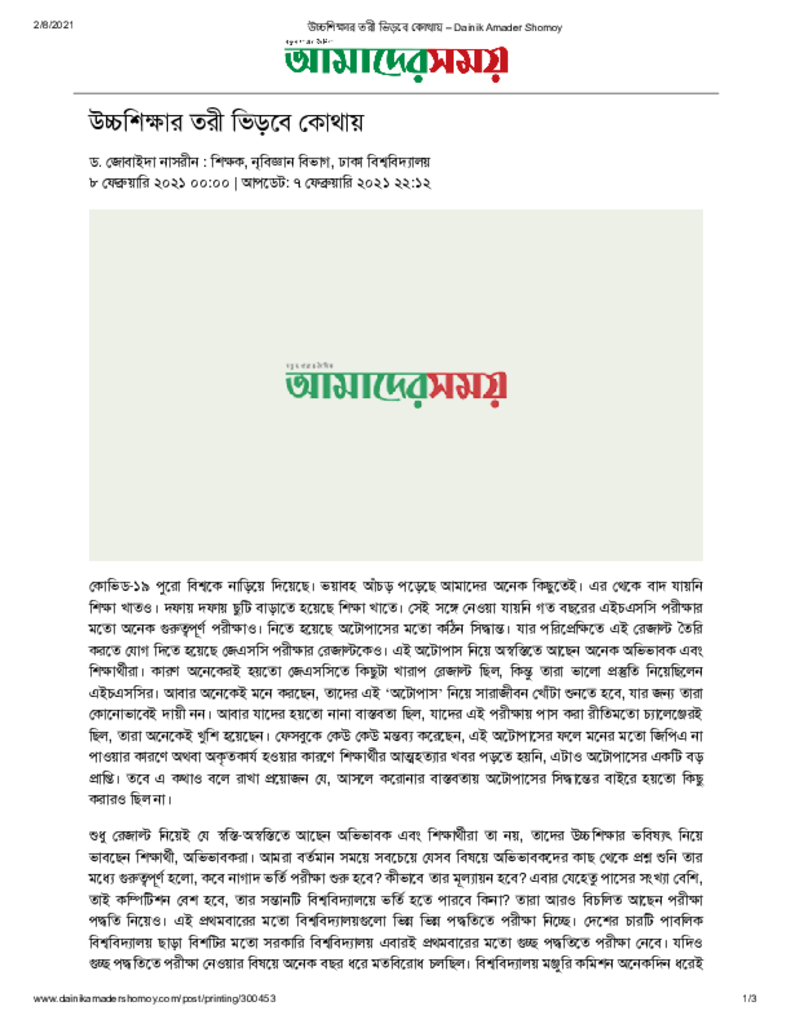 উচ্চশিক্ষার তরী ভিড়বে কোথায় – Dainik Amader Shomoy Published on 08 February 2021 Newspaper দৈনিক আমাদের সময় Category Personal Opinion / Discussion / Commentary General Education Download