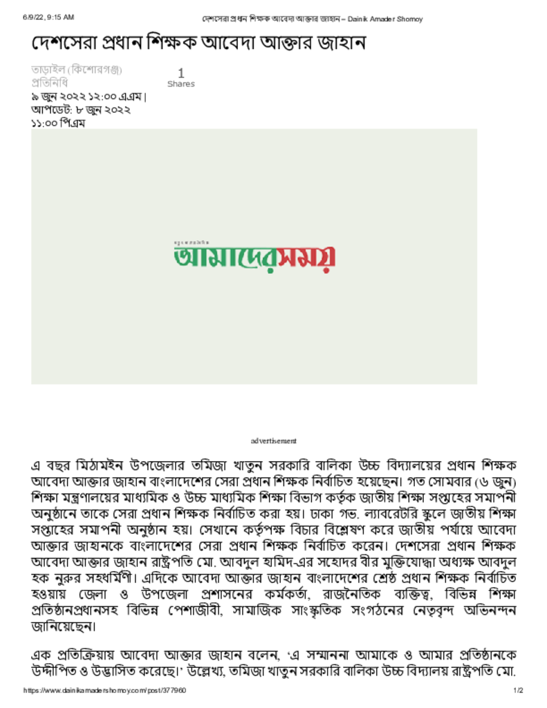 দেশসেরা প্রধান শিক্ষক আবেদা আক্তার জাহান – Dainik Amader Shomoy