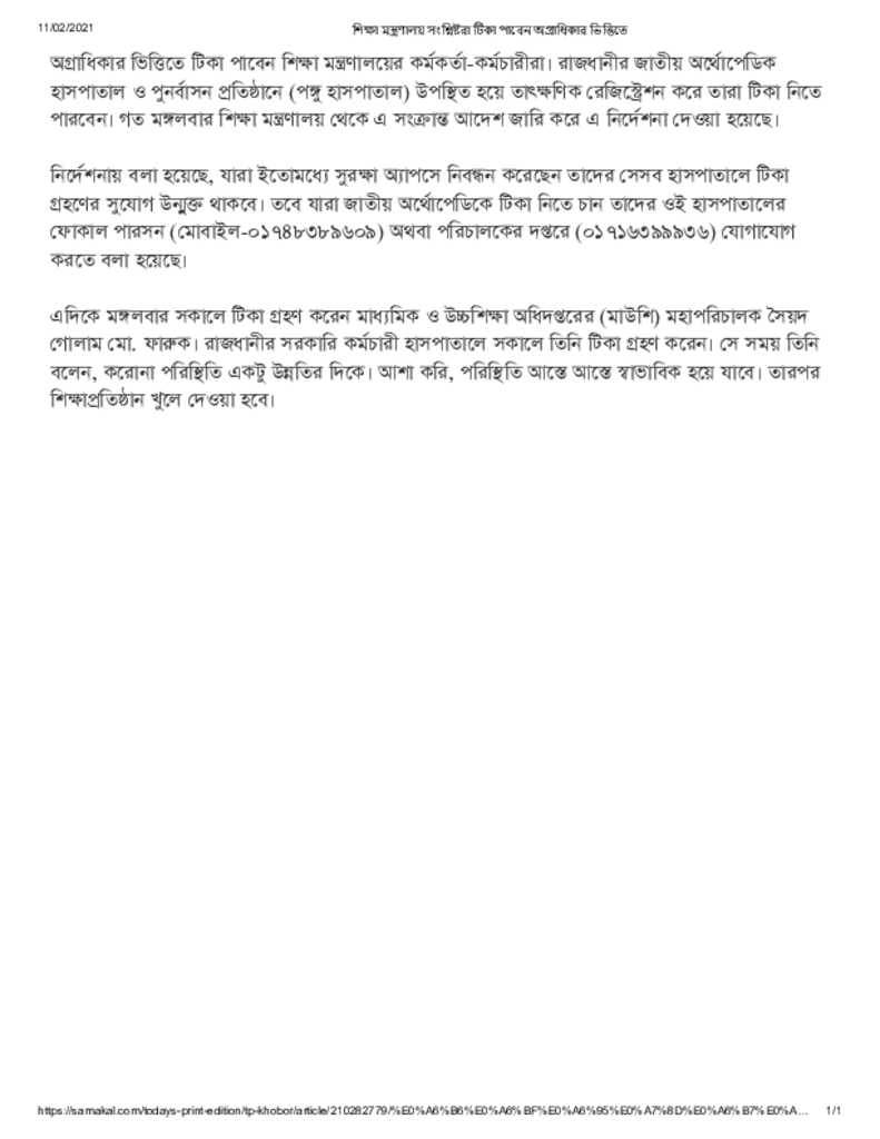 শিক্ষা মন্ত্রণালয় সংশ্নিষ্টরা টিকা পাবেন অগ্রাধিকার ভিত্তিতে Published on 11 February 2021 Newspaper দৈনিক সমকাল Category Educational Ministry / Departments Division Secondary and Higher Education Education Ministry / Division / Directorate Higher Education Public Download