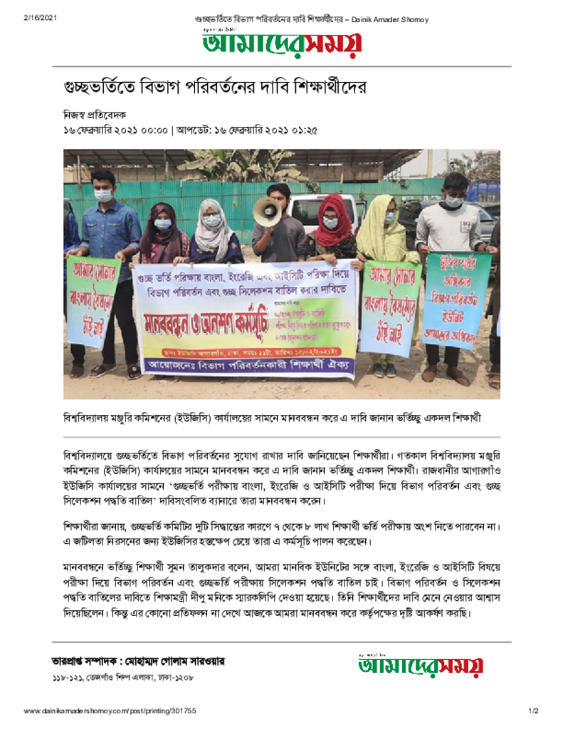 গুচ্ছভর্তিতে বিভাগ পরিবর্তনের দাবি শিক্ষার্থীদের – Dainik Amader Shomoy Published on 16 February 2021 Newspaper দৈনিক আমাদের সময় Category Admission / Seat Problem General Education Download