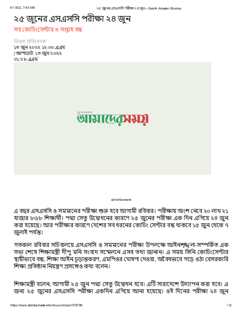 ২৫ জুনের এসএসসি পরীক্ষা ২৪ জুন – Dainik Amader Shomoy Published on 13 June 2022 Newspaper দৈনিক আমাদের সময় Category Public Examination Public Examination SSC Download