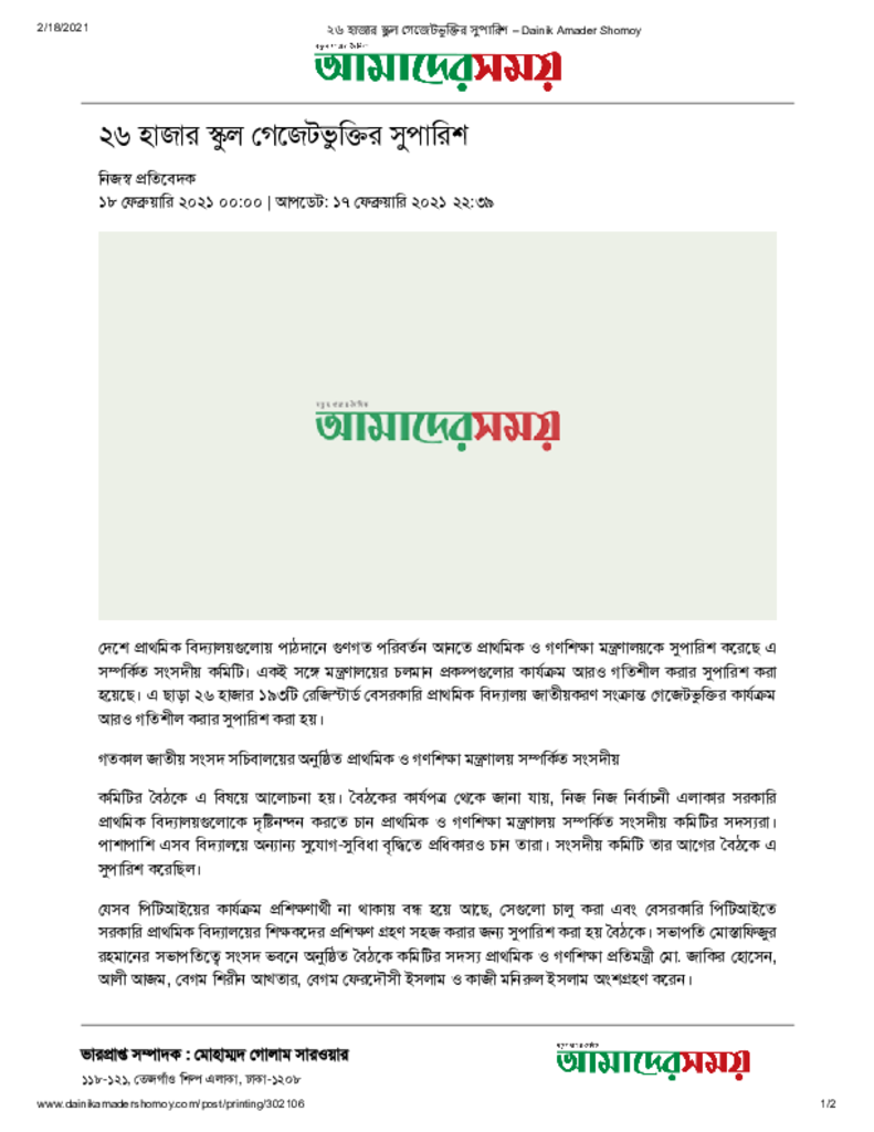 ২৬ হাজার স্কুল গেজেটভুক্তির সুপারিশ – Dainik Amader Shomoy Published on 18 February 2021 Newspaper দৈনিক আমাদের সময় Category Educational Ministry / Departments Download