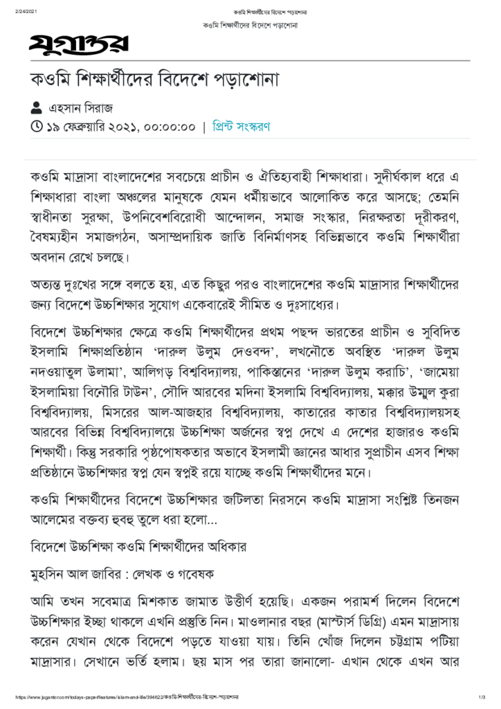 কওমি শিক্ষার্থীদের বিদেশে পড়াশোনা Published on 19 February 2021 Newspaper দৈনিক যুগান্তর Category Madrasah Education Madrasah Education Qawmi Download