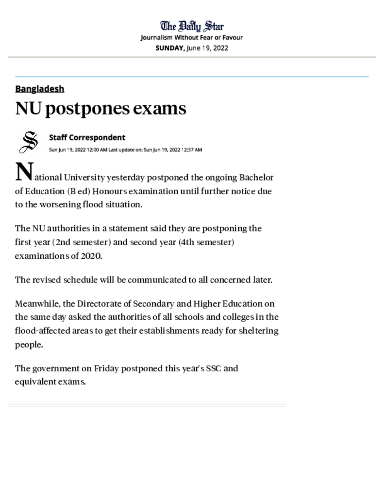 NU postpones exams _ The Daily Star Published on 19 June 2022 Newspaper The Daily Star Category Public Examination Public Examination Honors(Pass) Download