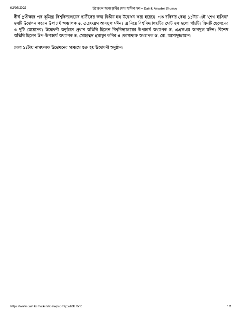 উদ্বোধন হলো কুবির শেখ হাসিনা হল – Dainik Amader Shomoy Published on 02 August 2022 Newspaper দৈনিক আমাদের সময় Category General Education General Education Higher Education Public Download