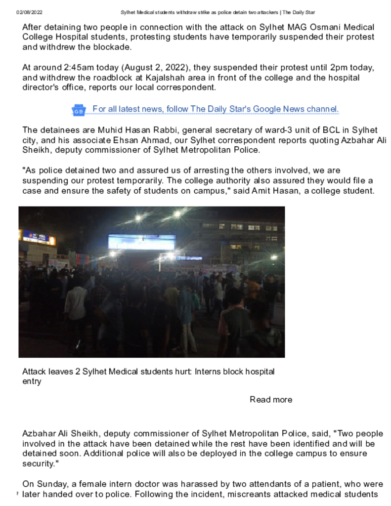 Sylhet Medical students withdraw strike as police detain two attackers _ The Daily Star Published on 02 August 2022 Newspaper The Daily Star Category Others Division Secondary and Higher Education Education Ministry / Division / Directorate Professional Education Medical Download