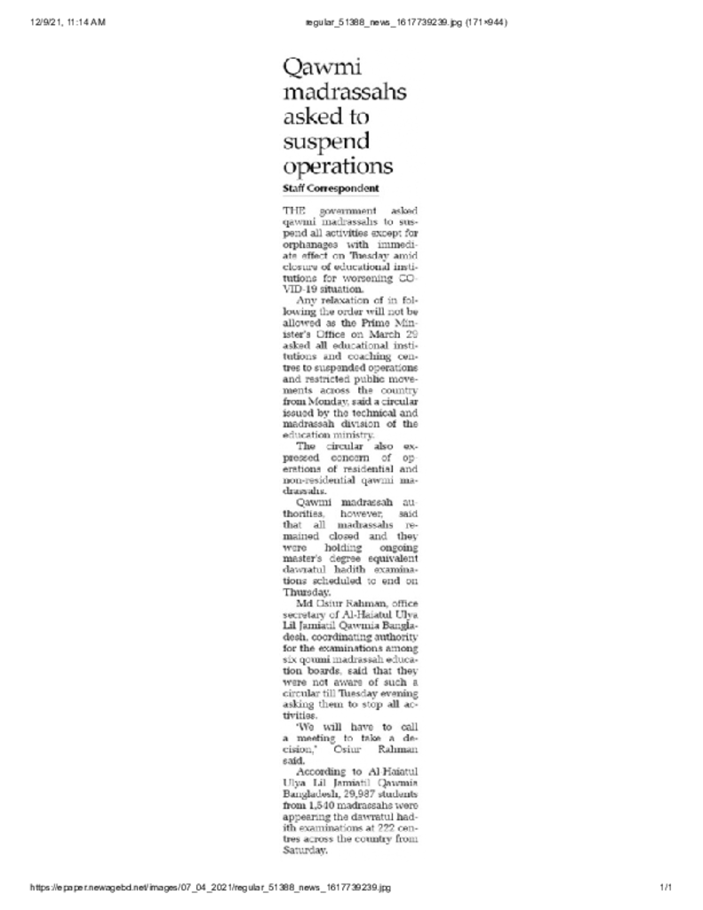 Qawmi madrassahs asked to suspend operations Published on 07 April 2021 Newspaper New Age Category Educational Ministry / Departments Madrasah Education Qawmi Download