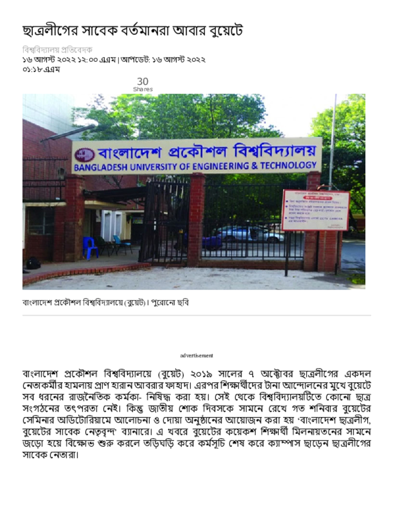 ছাত্রলীগের সাবেক বর্তমানরা আবার বুয়েটে – Dainik Amader Shomoy Published on 16 August 2022 Newspaper দৈনিক আমাদের সময় Category Student Politics Download