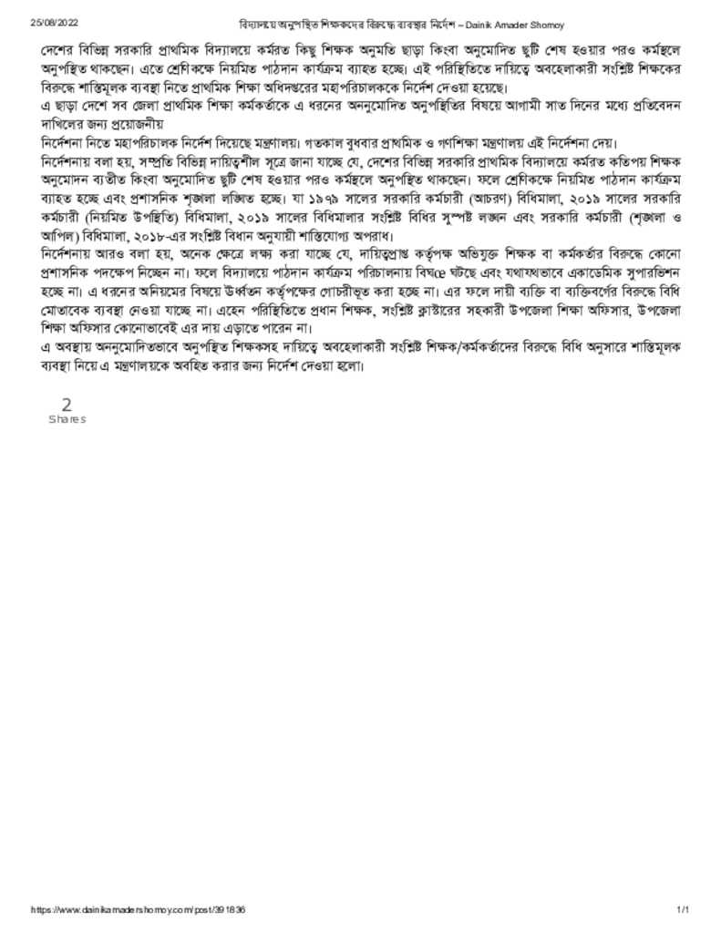 বিদ্যালয়ে অনুপস্থিত শিক্ষকদের বিরুদ্ধে ব্যবস্থার নির্দেশ – Dainik Amader Shomoy Published on 25 August 2022 Newspaper দৈনিক আমাদের সময় Category General Education Education Ministry / Division / Directorate General Education Download