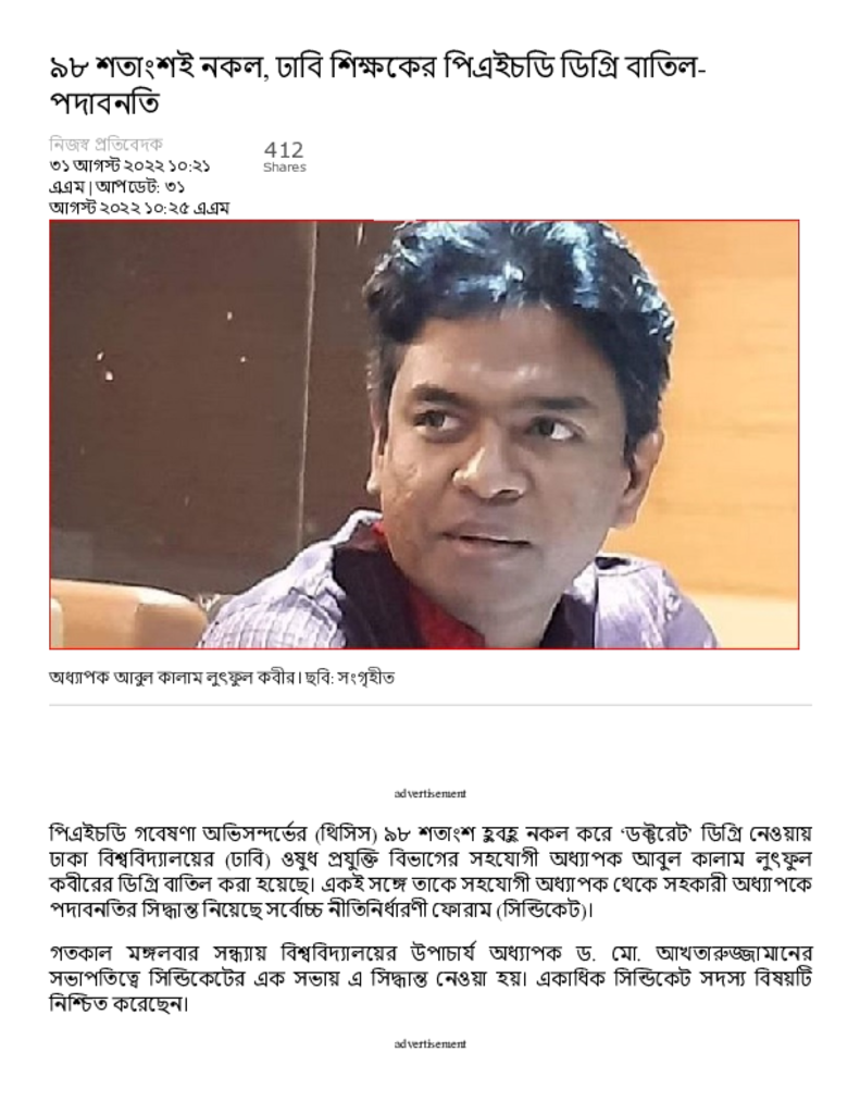 ৯৮ শতাংশই নকল, ঢাবি শিক্ষকের পিএইচডি ডিগ্রি বাতিল-পদাবনতি – Dainik Amader Shomoy Published on 31 August 2022 Newspaper দৈনিক আমাদের সময় Category General Education General Education Higher Education Public Download