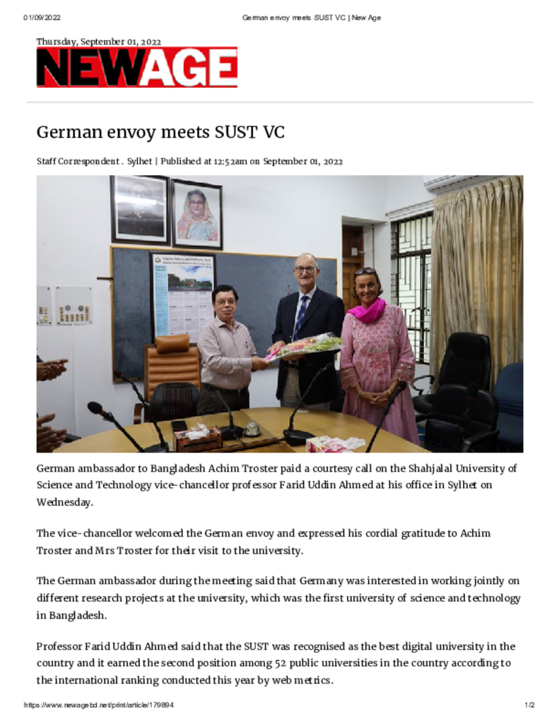 German envoy meets SUST VC _ New Age Published on 01 September 2022 Newspaper New Age Category Science Education Higher Education Public Download