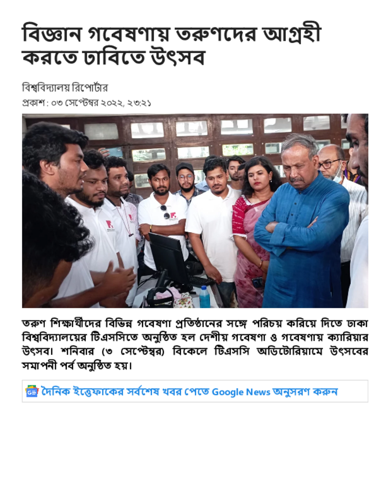 বিজ্ঞান গবেষণায় তরুণদের আগ্রহী করতে ঢাবিতে উৎসব Published on 03 September 2022 Newspaper দৈনিক ইত্তেফাক Category Science Education General Education Download