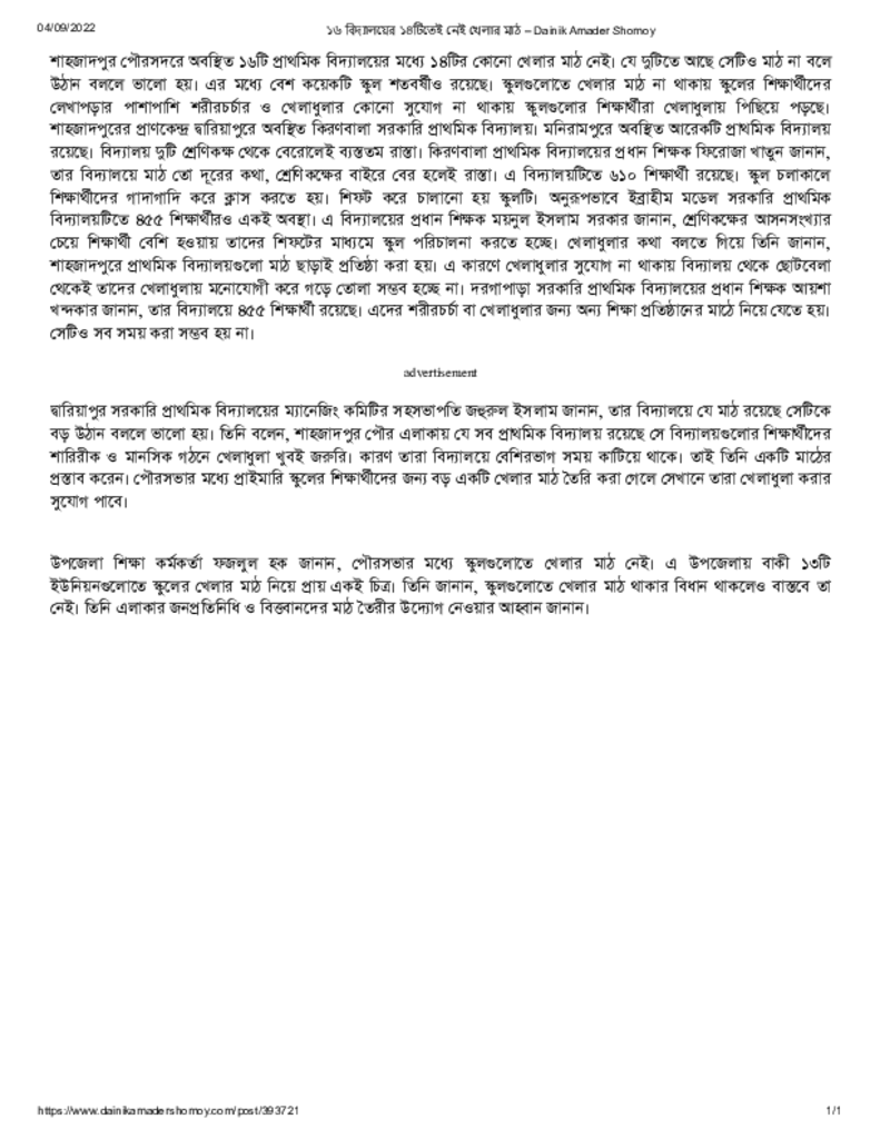১৬ বিদ্যালয়ের ১৪টিতেই নেই খেলার মাঠ – Dainik Amader Shomoy Published on 04 September 2022 Newspaper দৈনিক আমাদের সময় Category General Education General Education Download