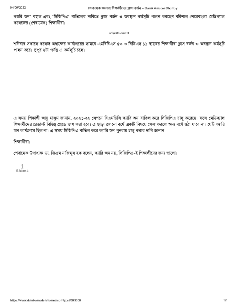 শেবামেক কলেজ শিক্ষার্থীদের ক্লাস বর্জন – Dainik Amader Shomoy Published on 04 September 2022 Newspaper দৈনিক আমাদের সময় Category Professional Education Professional Education Medical Download