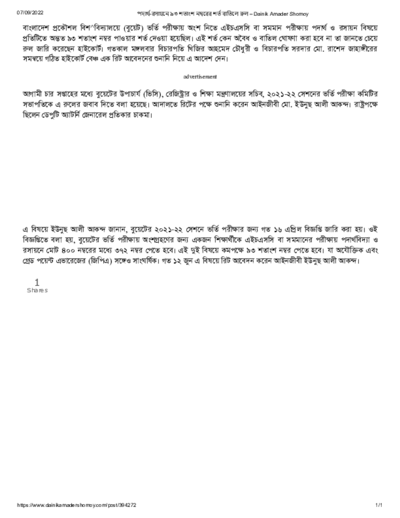 পদার্থ-রসায়নে ৯৩ শতাংশ নম্বরের শর্ত বাতিলে রুল – Dainik Amader Shomoy Published on 07 September 2022 Newspaper দৈনিক আমাদের সময় Category General Education General Education Higher Education Public Download