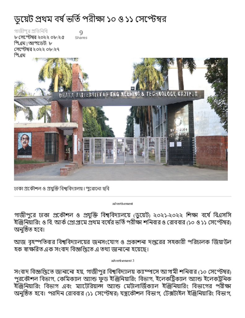 ডুয়েট প্রথম বর্ষ ভর্তি পরীক্ষা ১০ ও ১১ সেপ্টেম্বর – Dainik Amader Shomoy Published on 08 September 2022 Newspaper দৈনিক আমাদের সময় Category Admission / Seat Problem General Education Download