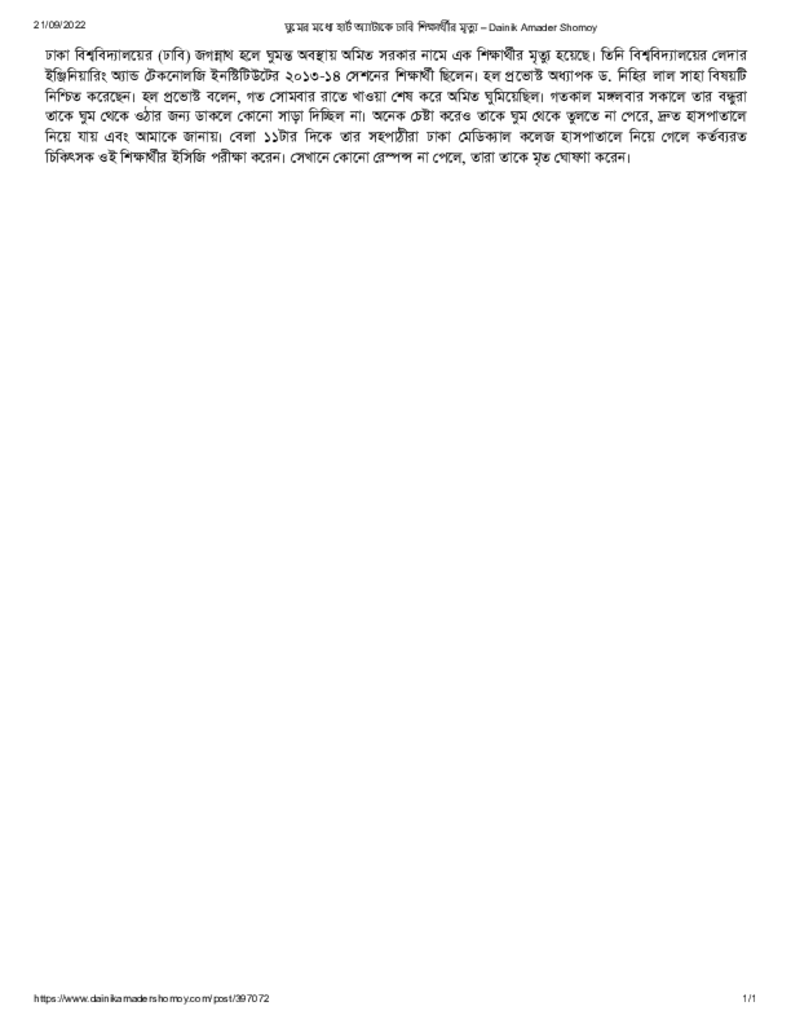 ঘুমের মধ্যে হার্ট অ্যাটাকে ঢাবি শিক্ষার্থীর মৃত্যু – Dainik Amader Shomoy Published on 21 September 2022 Newspaper দৈনিক আমাদের সময় Category General Education General Education Higher Education Public Download
