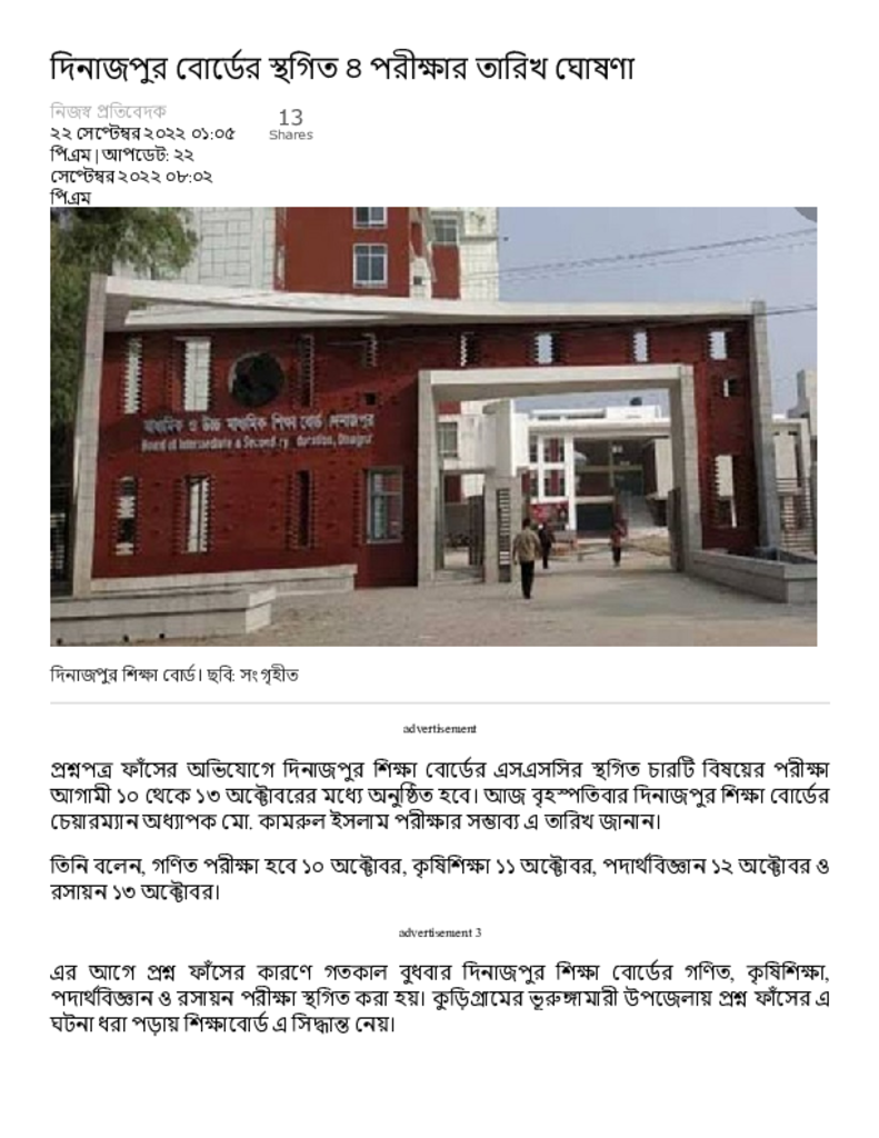 দিনাজপুর বোর্ডের স্থগিত ৪ পরীক্ষার তারিখ ঘোষণা – Dainik Amader Shomoy