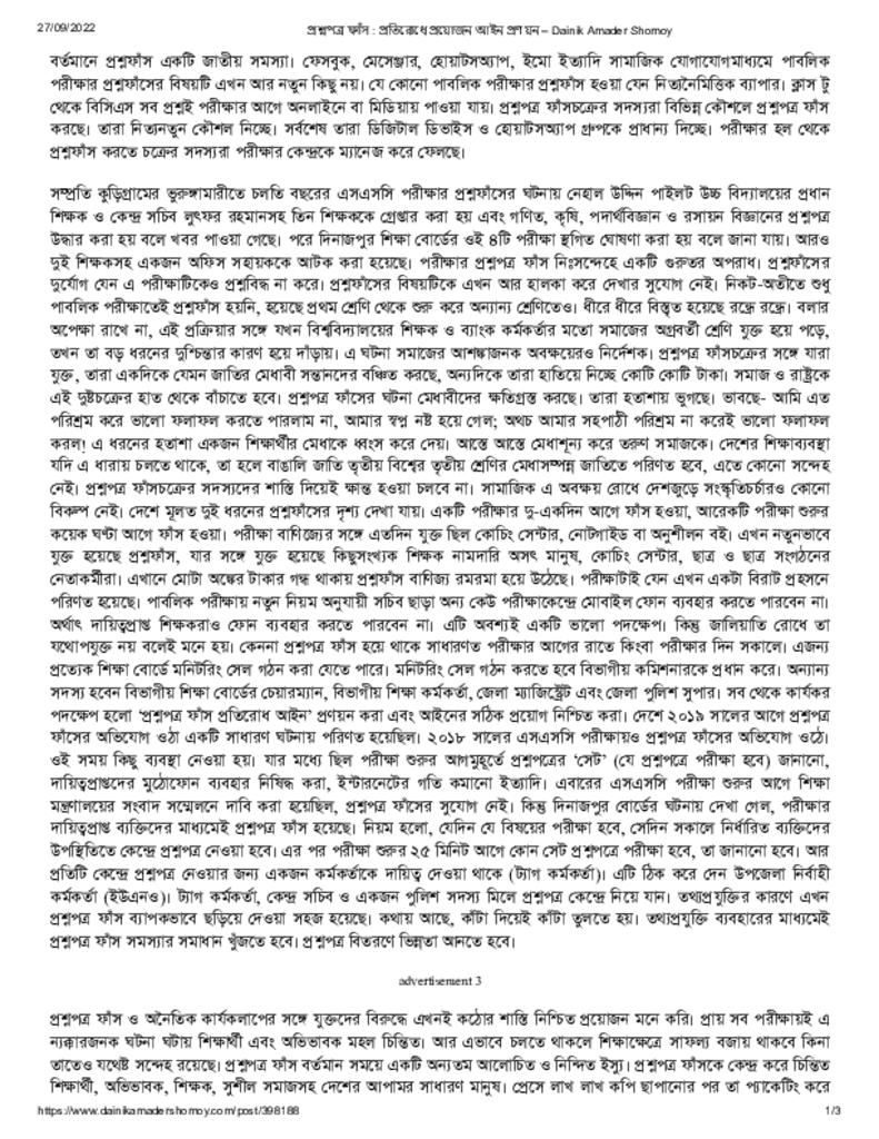 প্রশ্নপত্র ফাঁস _ প্রতিরোধে প্রয়োজন আইন প্রণয়ন – Dainik Amader Shomoy Published on 27 September 2022 Newspaper দৈনিক আমাদের সময় Category Personal Opinion / Discussion / Commentary Download