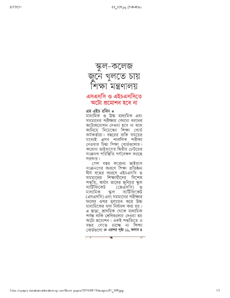 স্কুল কলেজ জুনে খুলতে চায় শিক্ষা মন্ত্রণালয় Published on 19 May 2021 Newspaper দৈনিক আমাদের সময় Category Educational Ministry / Departments Download