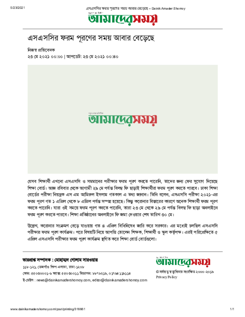 এসএসসির ফরম পূরণের সময় আবার বেড়েছে – Dainik Amader Shomoy Published on 23 May 2021 Newspaper দৈনিক আমাদের সময় Category Public Examination Public Examination SSC Download