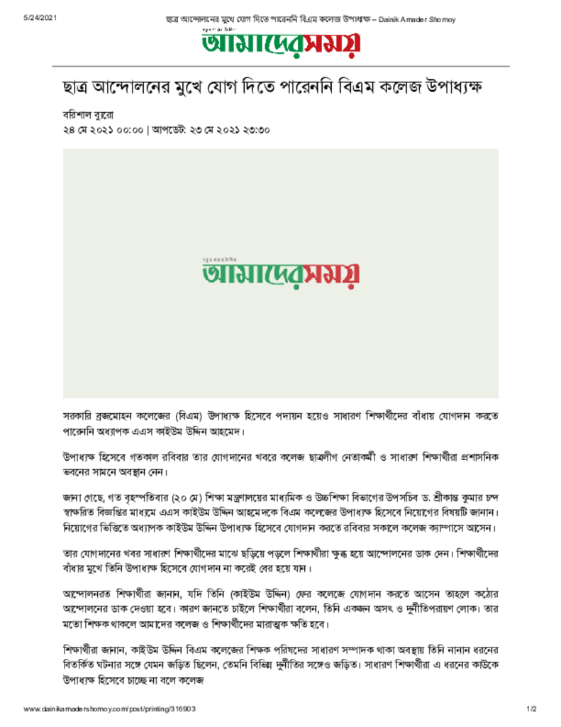 ছাত্র আন্দোলনের মুখে যোগ দিতে পারেননি বিএম কলেজ উপাধ্যক্ষ – Dainik Amader Shomoy