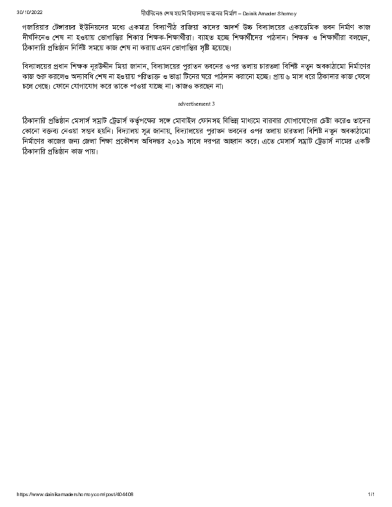 দীর্ঘদিনেও শেষ হয়নি বিদ্যালয় ভবনের নির্মাণ – Dainik Amader Shomoy Published on 30 October 2022 Newspaper দৈনিক আমাদের সময় Category General Education General Education Download