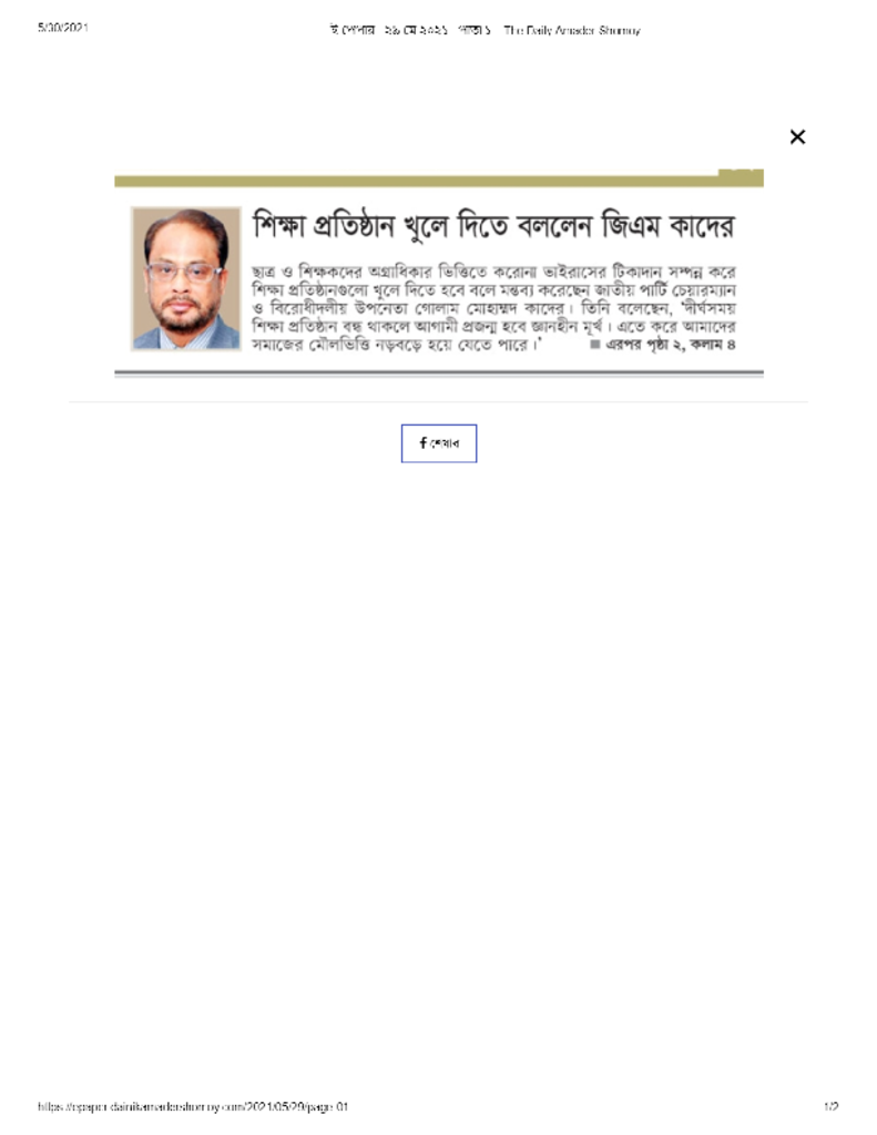 শিক্ষা প্রতিষ্ঠান খুলে দিতে বলল জিএম কাদের Published on 29 May 2021 Newspaper দৈনিক আমাদের সময় Category Personal Opinion / Discussion / Commentary Download