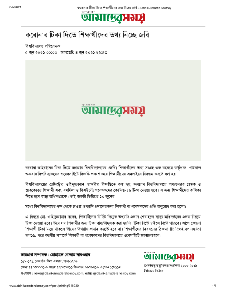 করোনার টিকা দিতে শিক্ষার্থীদের তথ্য নিচ্ছে জবি – Dainik Amader Shomoy