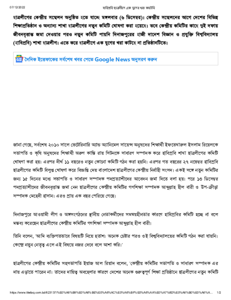 হাবিপ্রবি ছাত্রলীগে এক যুগের খরা কাটেনি Published on 07 December 2022 Newspaper দৈনিক ইত্তেফাক Category Science Education General Education Higher Education Public Download