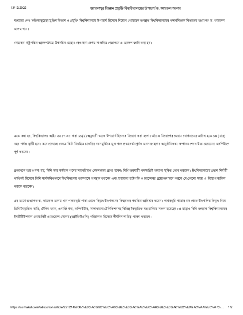 জামালপুর বিজ্ঞান প্রযুক্তি বিশ্ববিদ্যালয়ের উপাচার্য ড. কামরুল আলম Published on 13 December 2022 Newspaper দৈনিক সমকাল Category Science Education General Education Higher Education Public Download