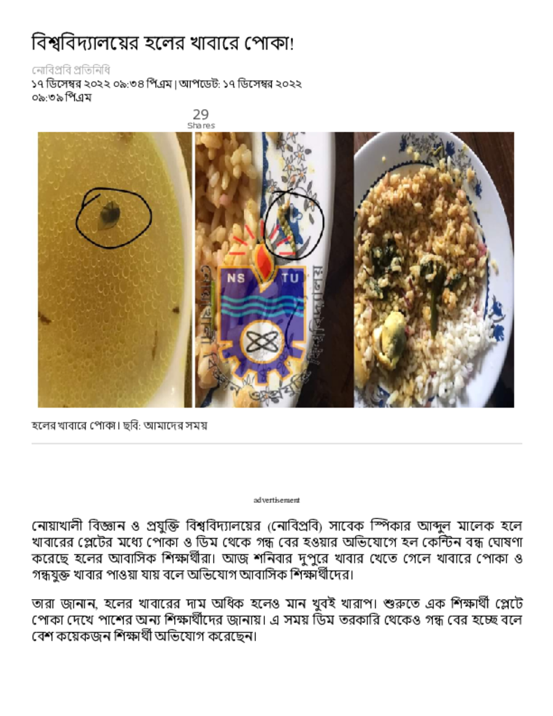 বিশ্ববিদ্যালয়ের হলের খাবারে পোকা! – Dainik Amader Shomoy Published on 17 December 2022 Newspaper দৈনিক আমাদের সময় Category Personal Opinion / Discussion / Commentary General Education Download