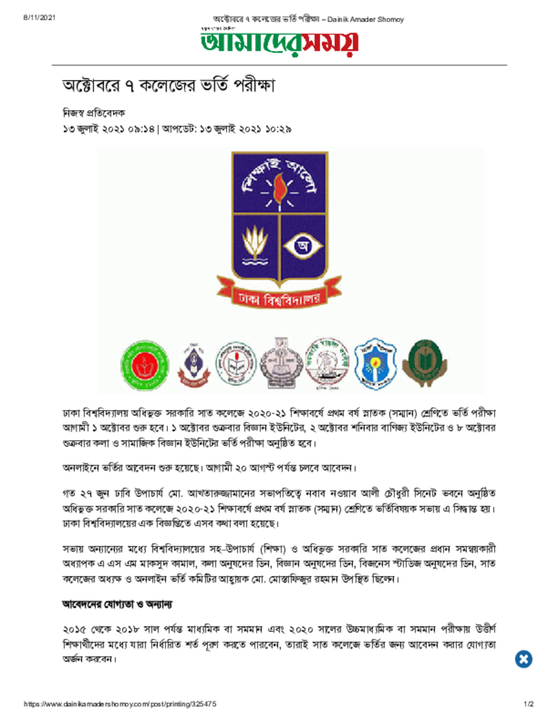 অক্টোবরে ৭ কলেজের ভর্তি পরীক্ষা – Dainik Amader Shomoy Published on 13 July 2021 Newspaper দৈনিক আমাদের সময় Category Admission / Seat Problem General Education Download