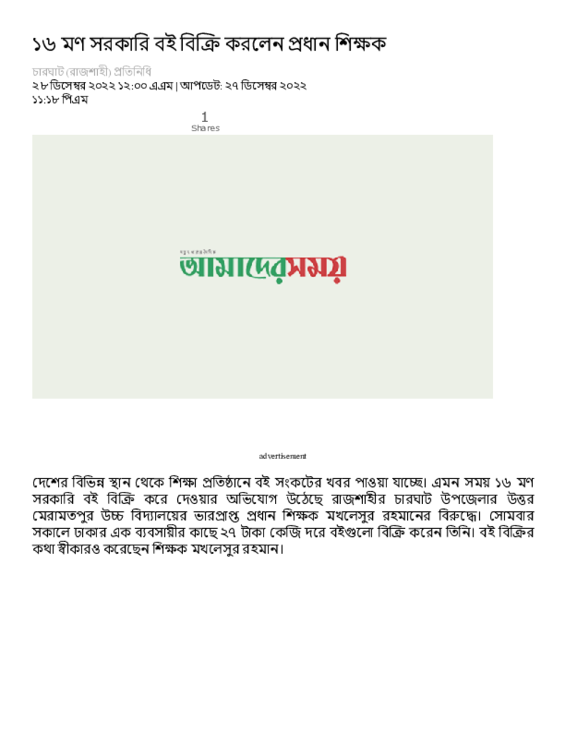 ১৬ মণ সরকারি বই বিক্রি করলেন প্রধান শিক্ষক – Dainik Amader Shomoy.pdf Published on 28 December 2022 Newspaper দৈনিক আমাদের সময় Category Others Download