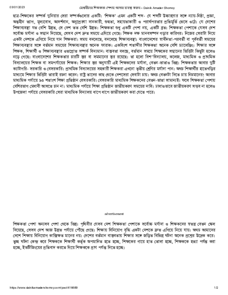 মেধাবীদের শিক্ষকতা পেশায় আসার ব্যবস্থা করুন – Dainik Amader Shomoy Published on 03 January 2023 Newspaper দৈনিক আমাদের সময় Category Personal Opinion / Discussion / Commentary Download