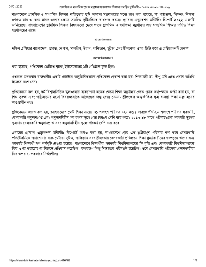 প্রাথমিক ও মাধ্যমিক পৃথক মন্ত্রণালয়ে বাধাগ্রস্ত শিক্ষার সমন্বিত দৃষ্টিভঙ্গি – Dainik Amader Shomoy Published on 04 January 2023 Newspaper দৈনিক আমাদের সময় Category Educational Ministry / Departments Download