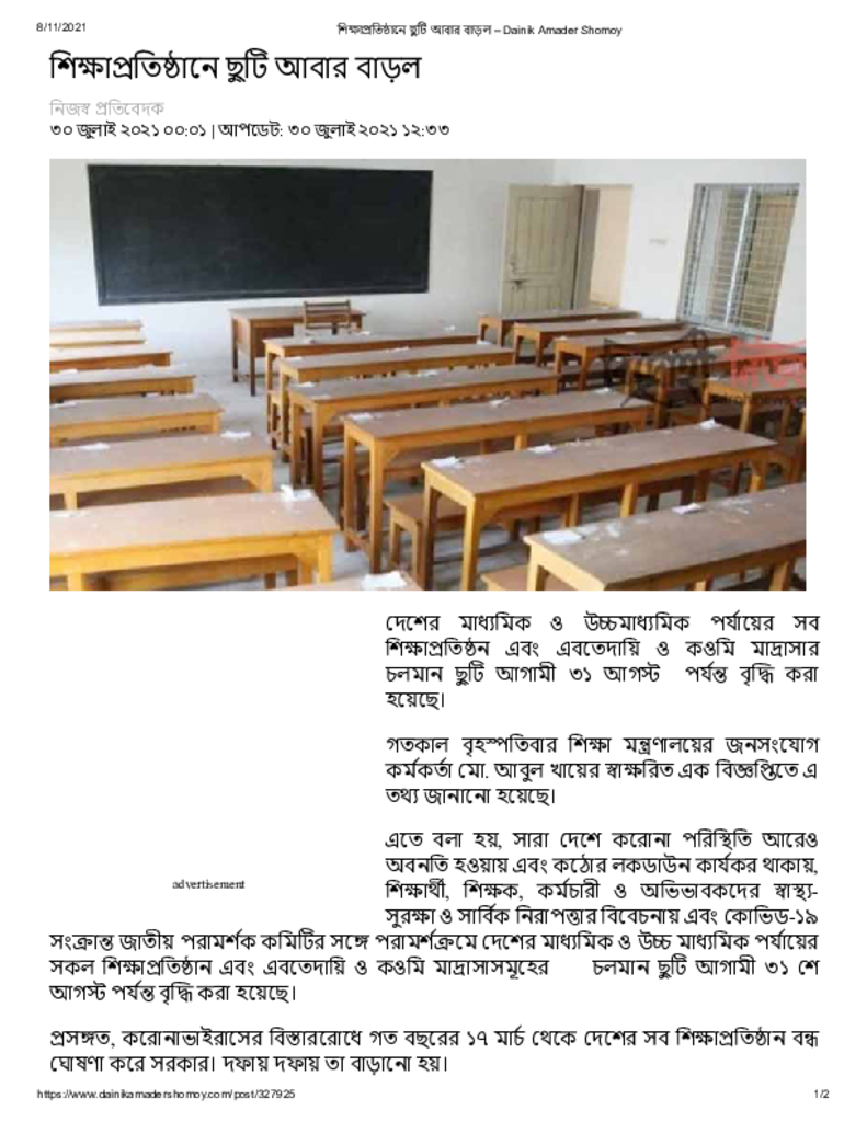 শিক্ষাপ্রতিষ্ঠানে ছুটি আবার বাড়ল – Dainik Amader Shomoy.pdf Published on 30 July 2021 Newspaper দৈনিক আমাদের সময় Category Educational Ministry / Departments Download