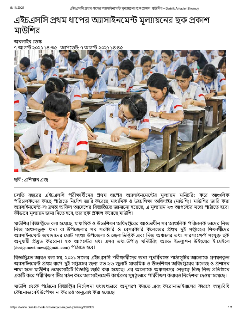 এইচএসসি প্রথম ধাপের অ্যাসাইনমেন্ট মূল্যায়নের ছক প্রকাশ মাউশির – Dainik Amader Shomoy.pdf Published on 07 August 2021 Newspaper দৈনিক আমাদের সময় Category Educational Ministry / Departments Download