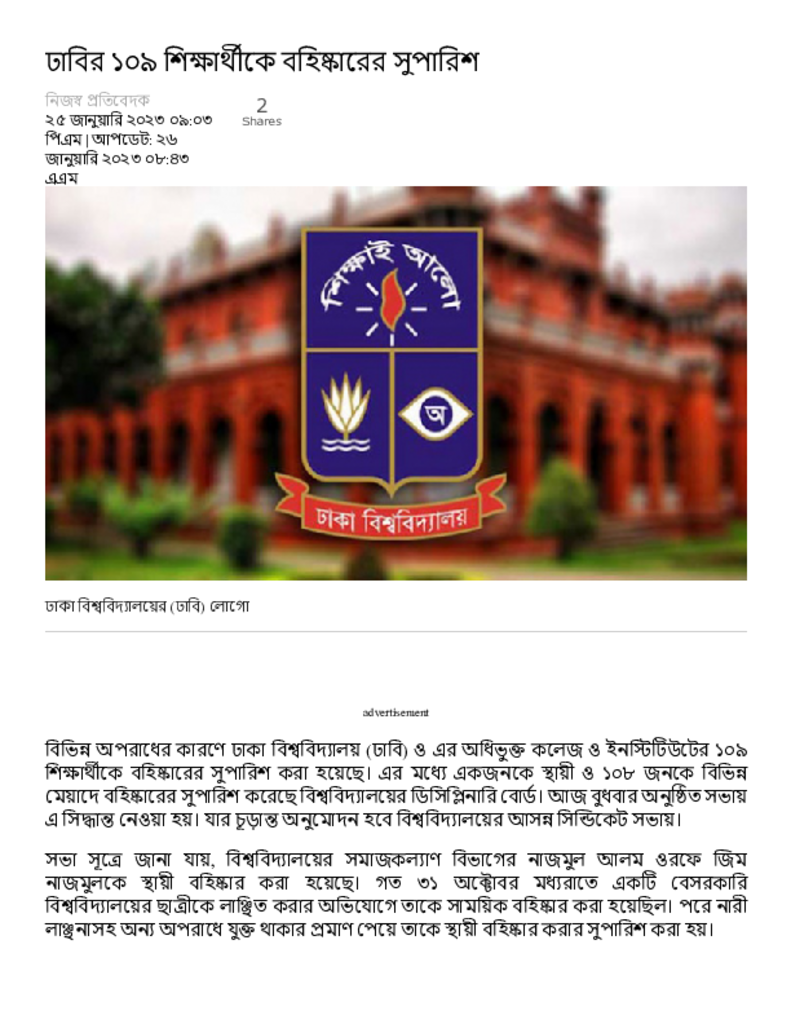 ঢাবির ১০৯ শিক্ষার্থীকে বহিষ্কারের সুপারিশ – Dainik Amader Shomoy.pdf Published on 26 January 2023 Newspaper দৈনিক আমাদের সময় Category General Education General Education Download