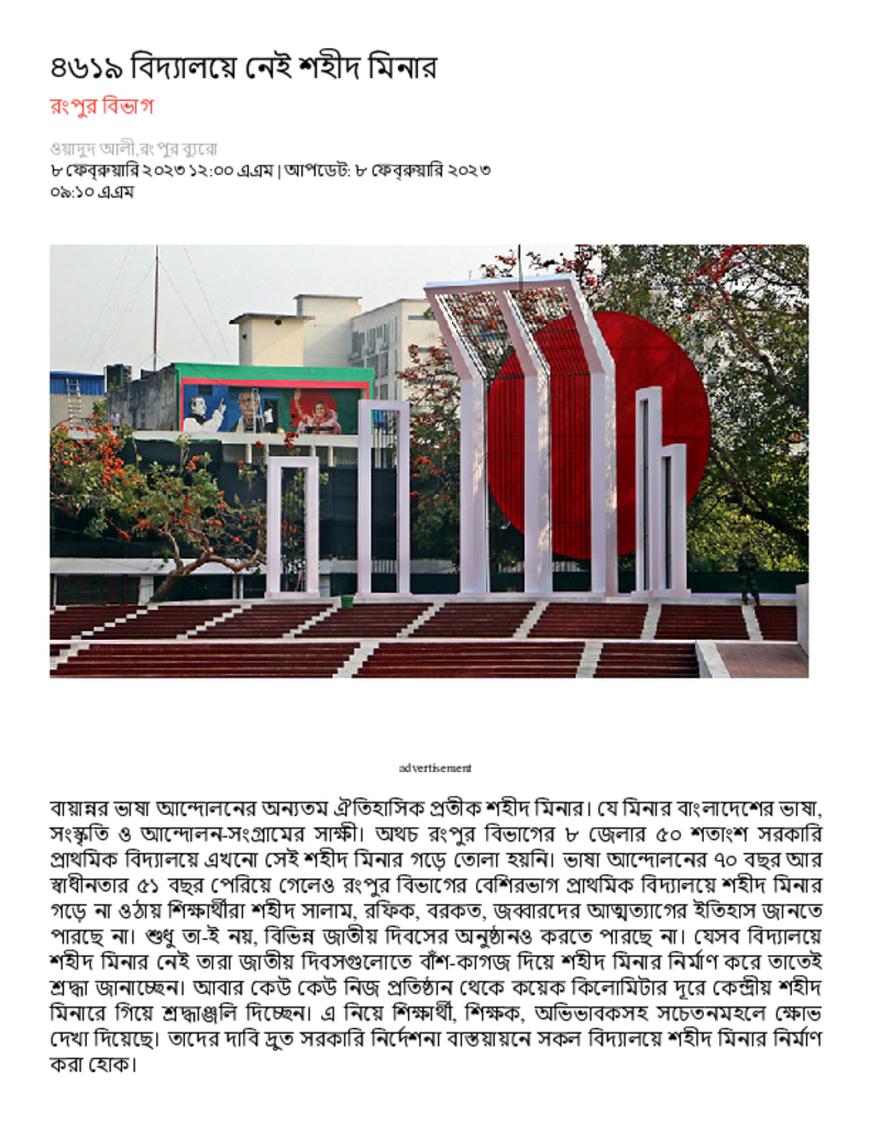 ৪৬১৯ বিদ্যালয়ে নেই শহীদ মিনার – Dainik Amader Shomoy.pdf Published on 08 February 2023 Newspaper দৈনিক আমাদের সময় Category General Education General Education Download