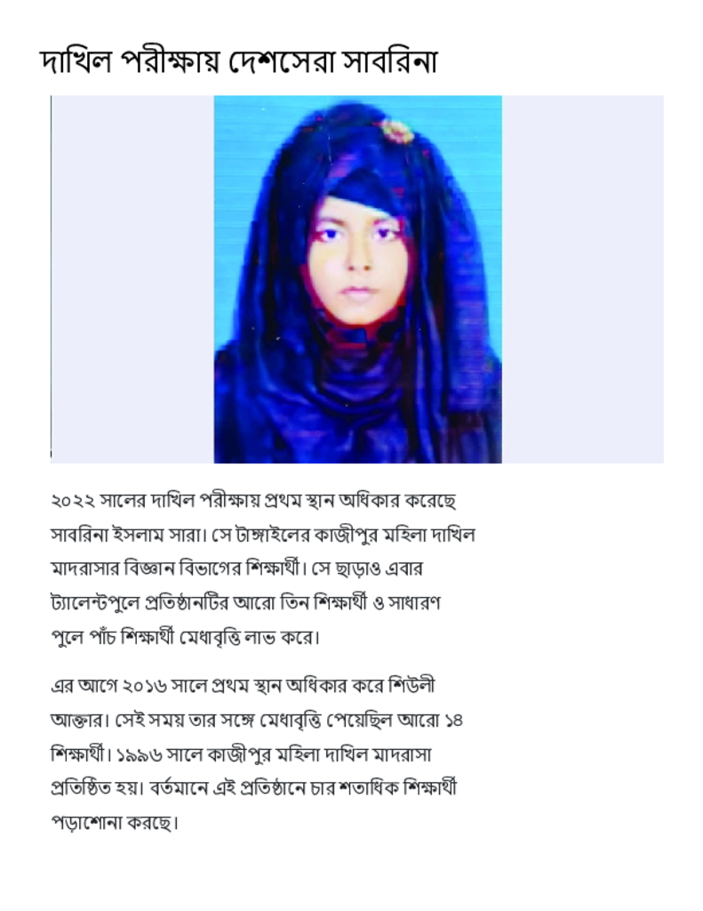 দাখিল পরীক্ষায় দেশসেরা সাবরিনা.pdf Published on 09 February 2023 Newspaper দৈনিক কালের কন্ঠ Category Madrasah Education Download