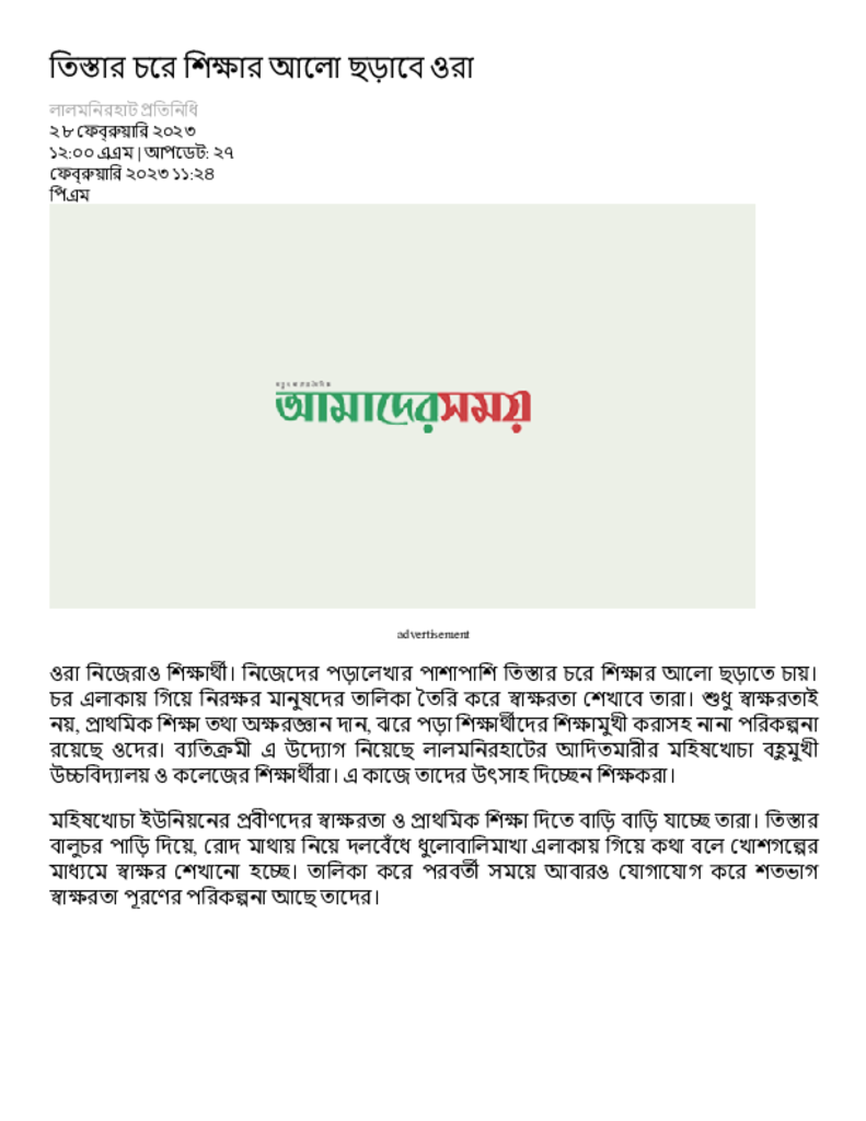 তিস্তার চরে শিক্ষার আলো ছড়াবে ওরা – Dainik Amader Shomoy.pdf Published on 28 February 2023 Newspaper দৈনিক আমাদের সময় Category Others Download