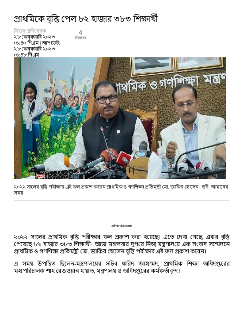 প্রাথমিকে বৃত্তি পেল ৮২ হাজার ৩৮৩ শিক্ষার্থী – Dainik Amader Shomoy.pdf Published on 28 February 2023 Newspaper দৈনিক আমাদের সময় Category Educational Ministry / Departments Education Ministry / Division / Directorate Download