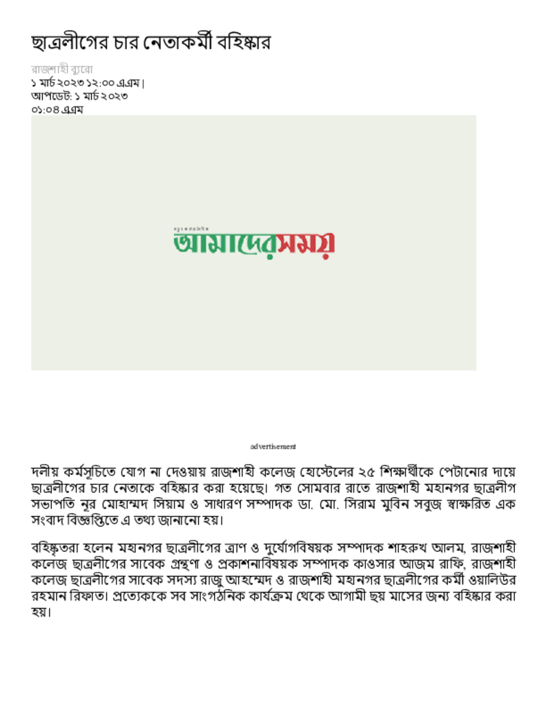 ছাত্রলীগের চার নেতাকর্মী বহিষ্কার – Dainik Amader Shomoy.pdf Published on 01 March 2023 Newspaper দৈনিক আমাদের সময় Category Student Politics General Education Download