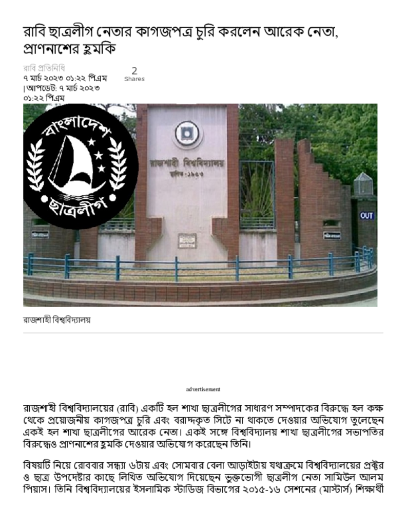 রাবি ছাত্রলীগ নেতার কাগজপত্র চুরি করলেন আরেক নেতা, প্রাণনাশের হুমকি – Dainik Amader Shomoy.pdf Published on 07 March 2023 Newspaper দৈনিক আমাদের সময় Category Others Download