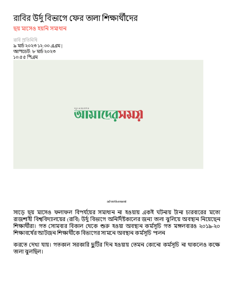 রাবির উর্দু বিভাগে ফের তালা শিক্ষার্থীদের – Dainik Amader Shomoy.pdf Published on 09 March 2023 Newspaper দৈনিক আমাদের সময় Category General Education General Education Download