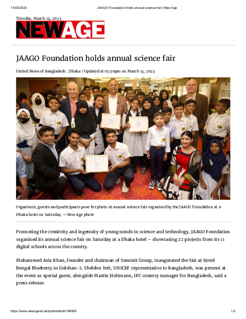 JAAGO Foundation holds annual science fair _ New Age Published on 13 March 2023 Newspaper New Age Category Science Education Download