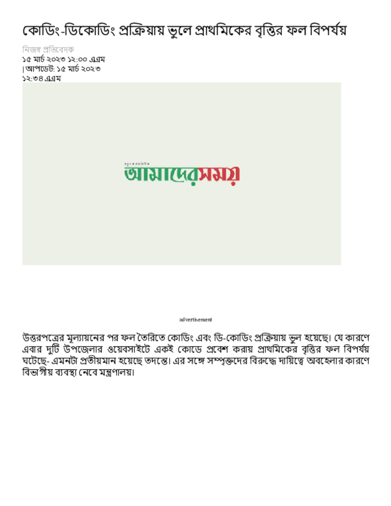 কোডিং-ডিকোডিং প্রক্রিয়ায় ভুলে প্রাথমিকের বৃত্তির ফল বিপর্যয় – Dainik Amader Shomoy.pdf Published on 15 March 2023 Newspaper দৈনিক আমাদের সময় Category Educational Ministry / Departments Education Ministry / Division / Directorate Download