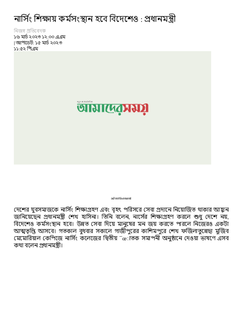 নার্সিং শিক্ষায় কর্মসংস্থান হবে বিদেশেও _ প্রধানমন্ত্রী – Dainik Amader Shomoy.pdf Published on 16 March 2023 Newspaper দৈনিক আমাদের সময় Category Professional Education Professional Education Medical Download